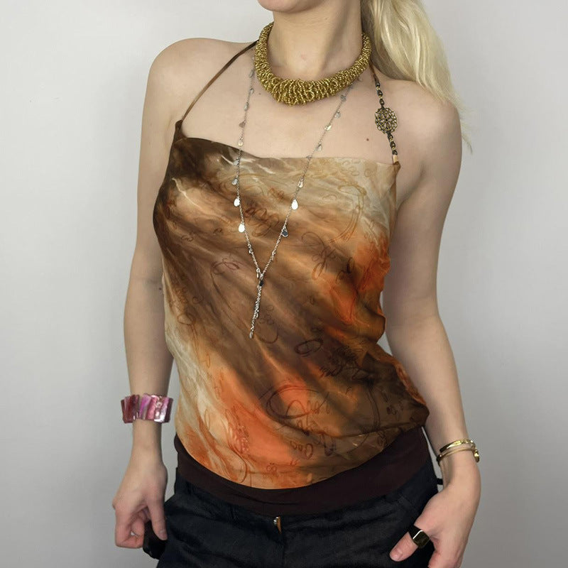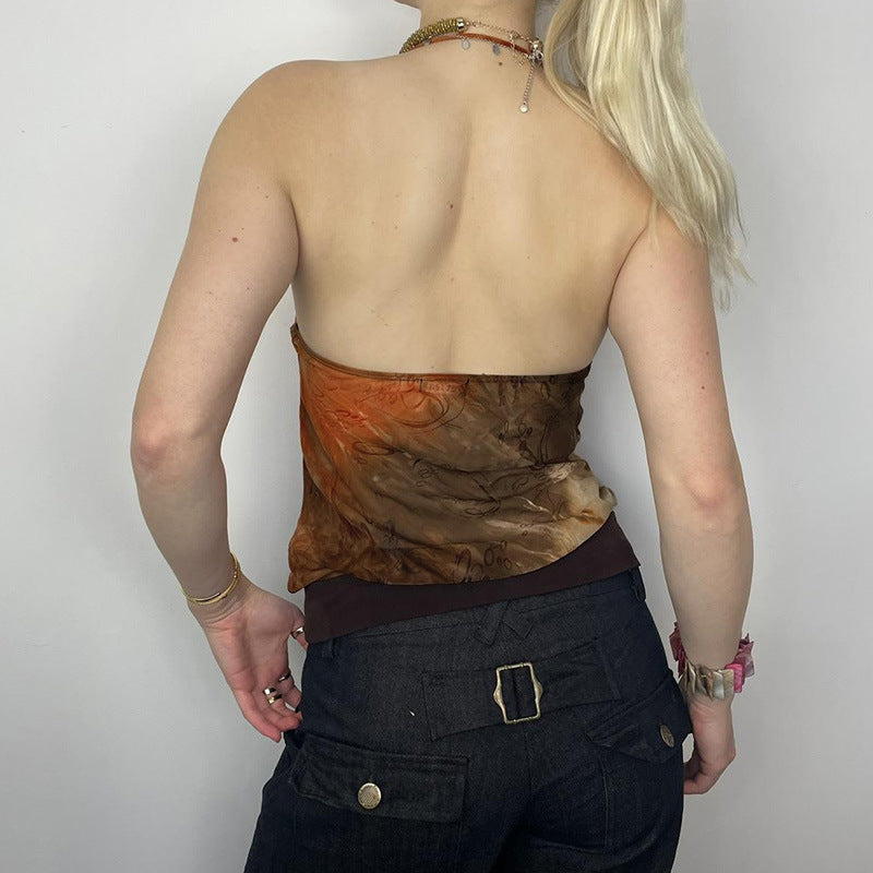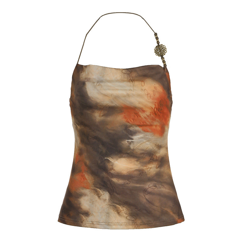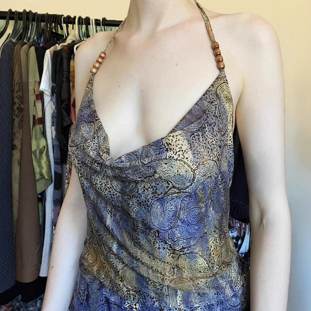 Color Printed Sexy Beaded Halter Backless Hot Tops