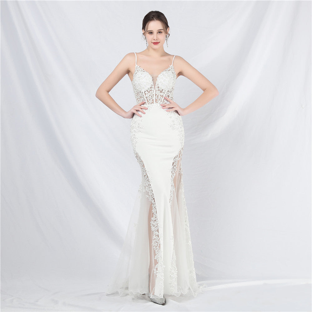 Lace Hot Rhinestone Fishbone Tight Waist Evening Dresses