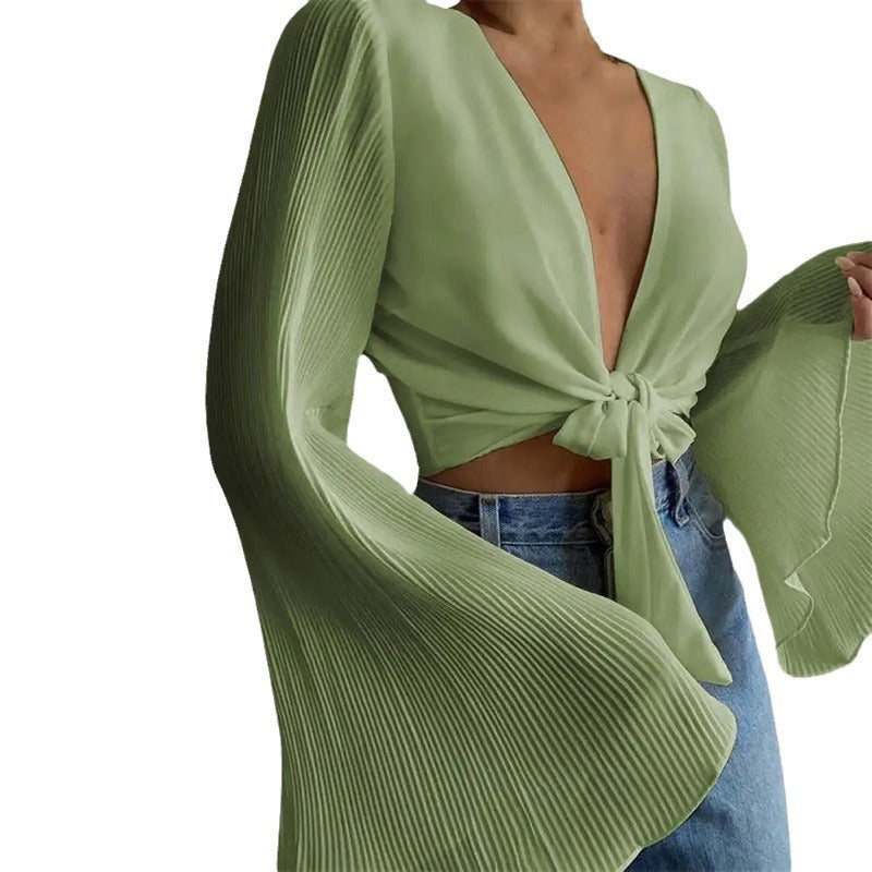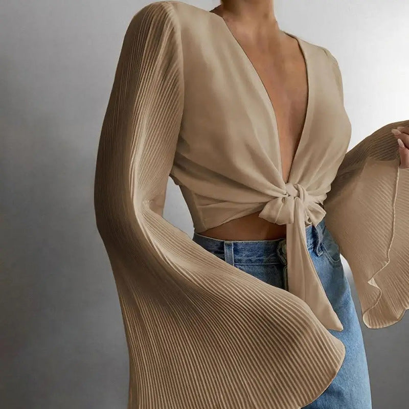 Mature Solid Color Pleated Extra Long Flare Sleeve Slim Blouses