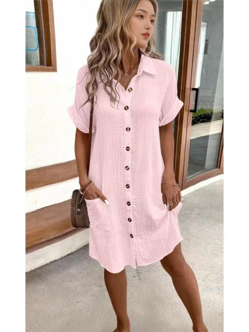 Women's Casual Solid Color Cotton Linen Breasted Mid-length Sleeve Clothing