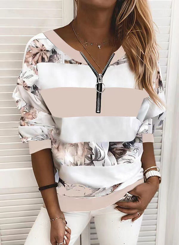 Women's Casual T-shirt Striped Digital Printing Zipper Blouses