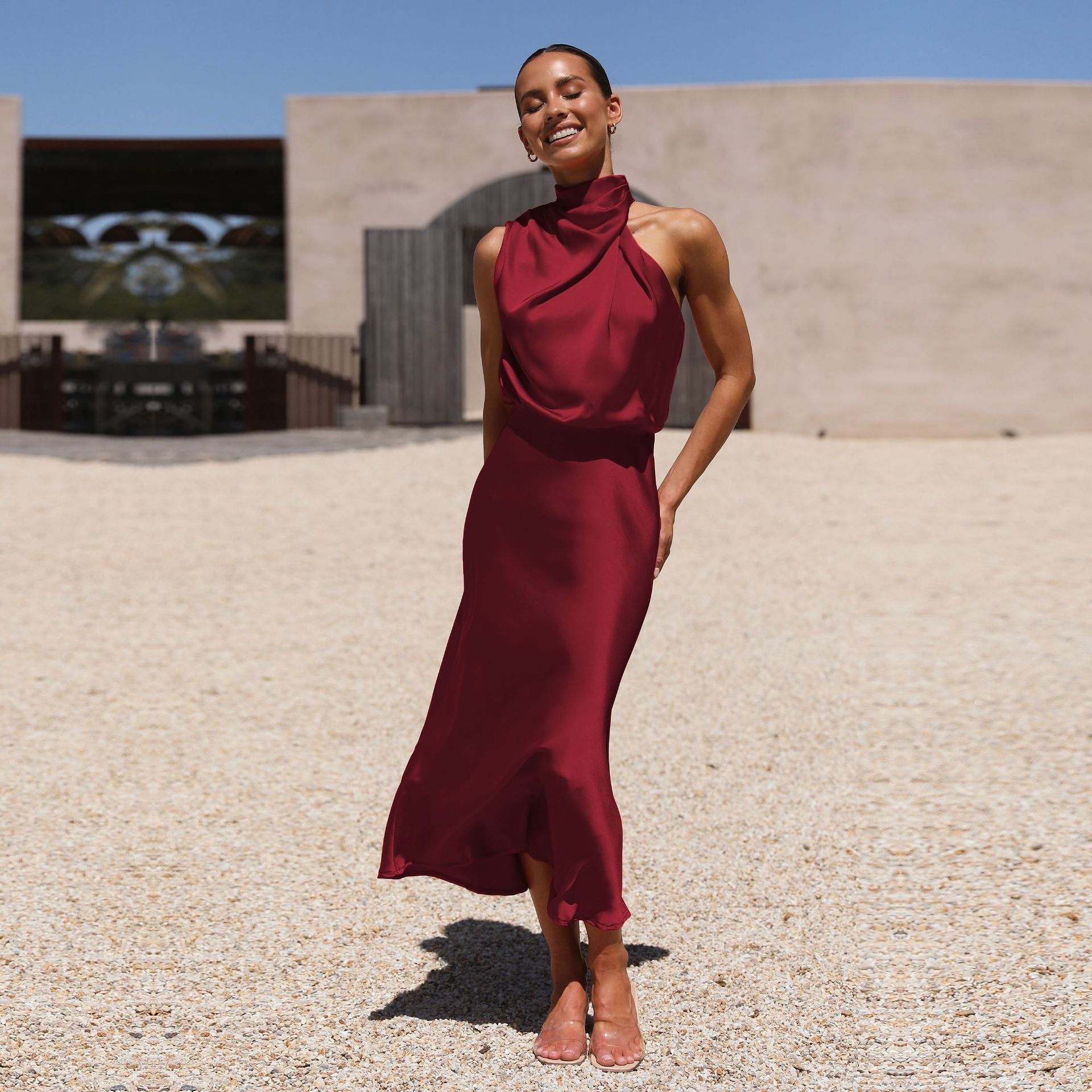 Women's Dress Bridesmaid Midi Halter Satin Evening Dresses