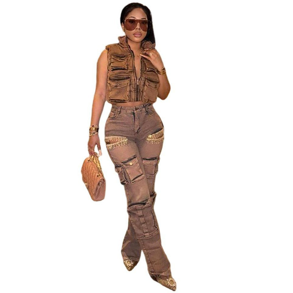 Women's Fashion Retro Tassel Pendant Drill Cargo Jeans