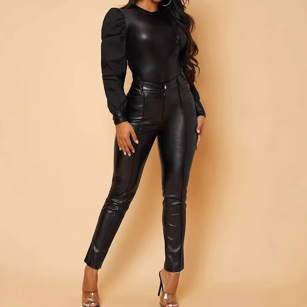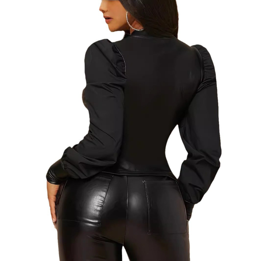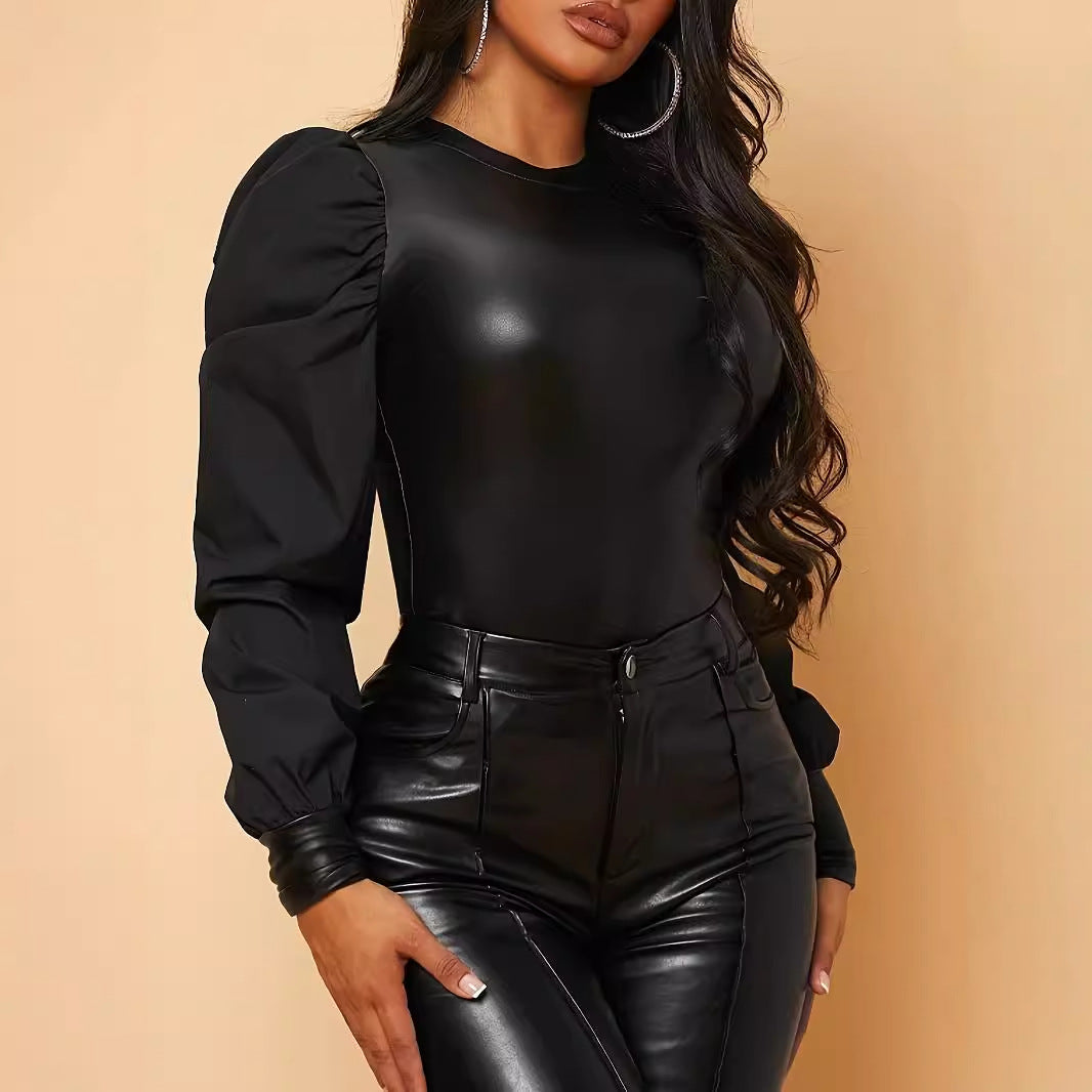 Women's Patent Leather Round Neck Long Sleeve Lantern Tops
