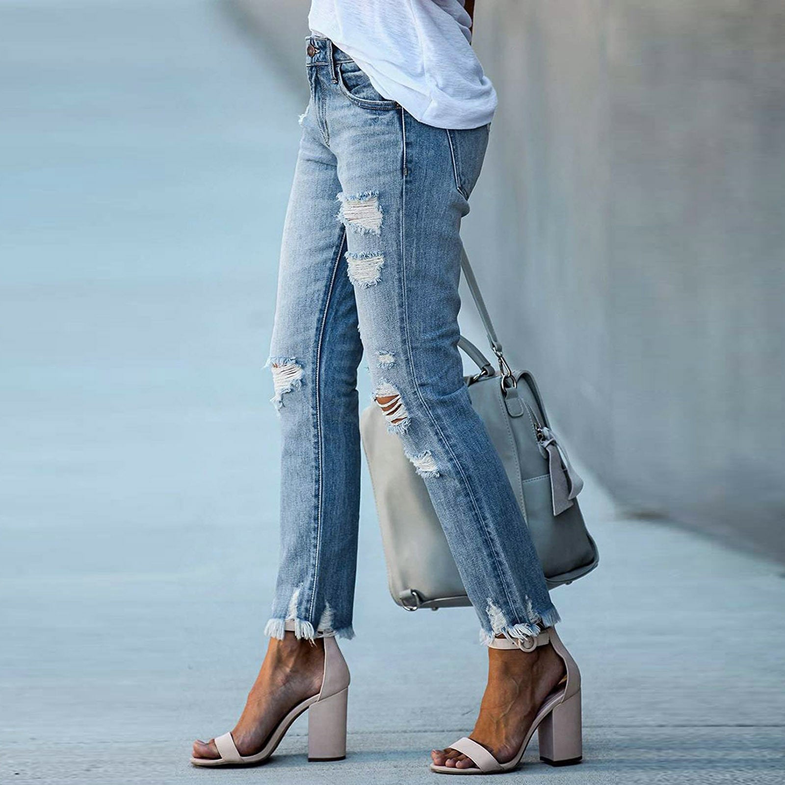 Women's Tight-fitting Solid Color Denim With Hole Jeans